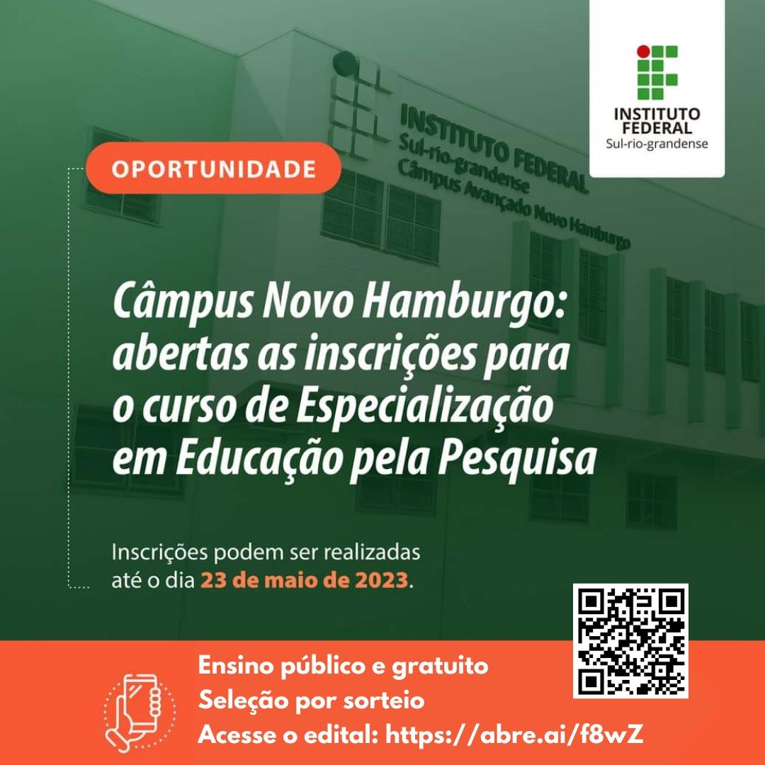 O IFSul Câmpus Novo Hamburgo está com inscrições abertas para o curso de Especialização em Educação pela Pesquisa. O curso é gratuito. Pessoas interessadas podem se inscrever até o dia 23 de maio, através de formulário eletrônico.
